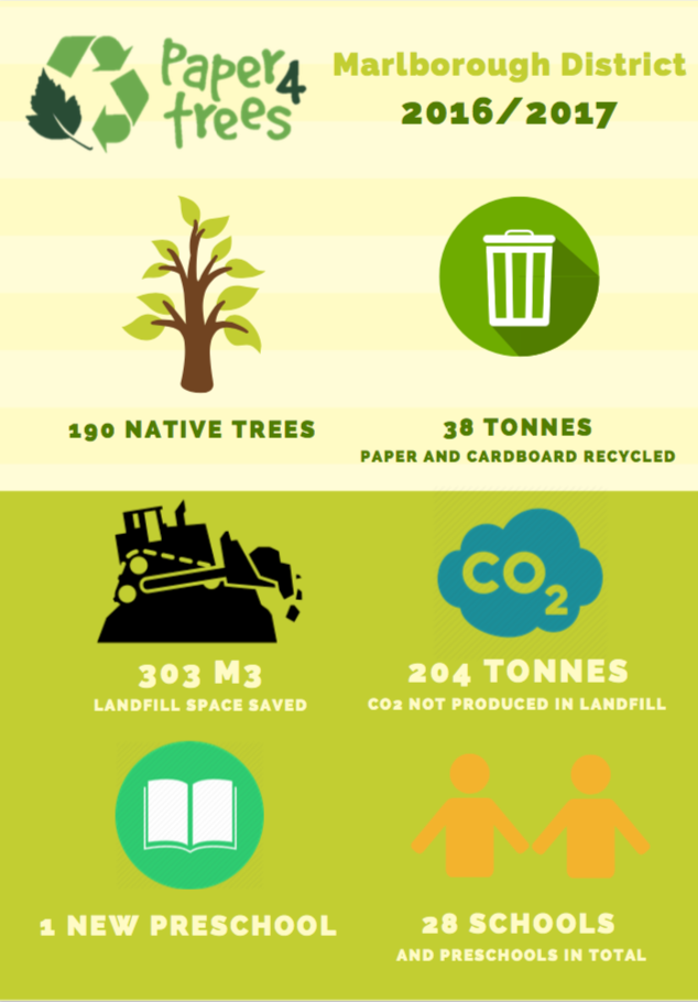 Through the Paper4Trees programme, 190 new native trees were earned in the 2016/2017 year, due to the recycling of 38 tonnes of paper and cardboard! These recycling efforts also saved over 300 m³ of landfill space, and prevented over 200 tonnes of CO2 from being produced in landfill. Since Marlborough joined in 2009, more than 1,300 trees have been earnt, through over 300 tonnes of paper and cardboard recycling. Ka mau te wehi, Marlborough!