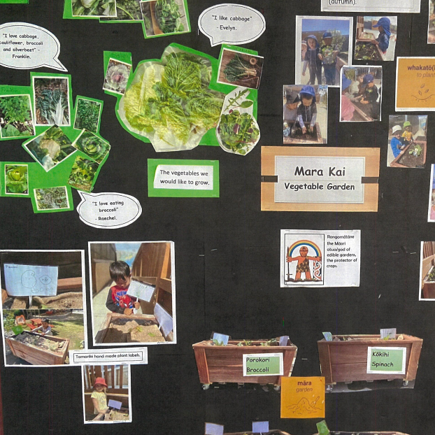 The tamariki have also been actively involved in planting vegetables around the kindergarten. They use their own compost to replenish their gardens. They are responsible for watering and caring for the plants. This has included looking for green caterpillars on the brassicas. As well as writing their own signs to identify what has been planted. This produce is often shared on the Pataka or used in cooking and baking.