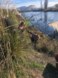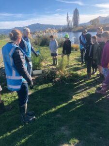 Wetland WarriorsTheir job for the morning was to plant grasses and trees on the banks of the lagoon just over the bridge near the car park.  22 eager students got to work after planting instructions were given, and gloves and spades found. The banks were tricky to dig into thanks to gravel and concrete left behind from a pig farm that occupied the space 20 years ago but with help from the volunteers some intrepid students took on the challenge carefully navigating the banks while others planted along the top.  In no time 30 metres of the banks were planted, ensuring future homes for birds, geckos and insects and shady habitats in the water for fish, eel and water invertebrates.