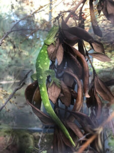 To find the well camouflaged gecko in their aviary habitats good eyesight was needed. The brightly coloured kakariki on the other hand  were easy to sight.