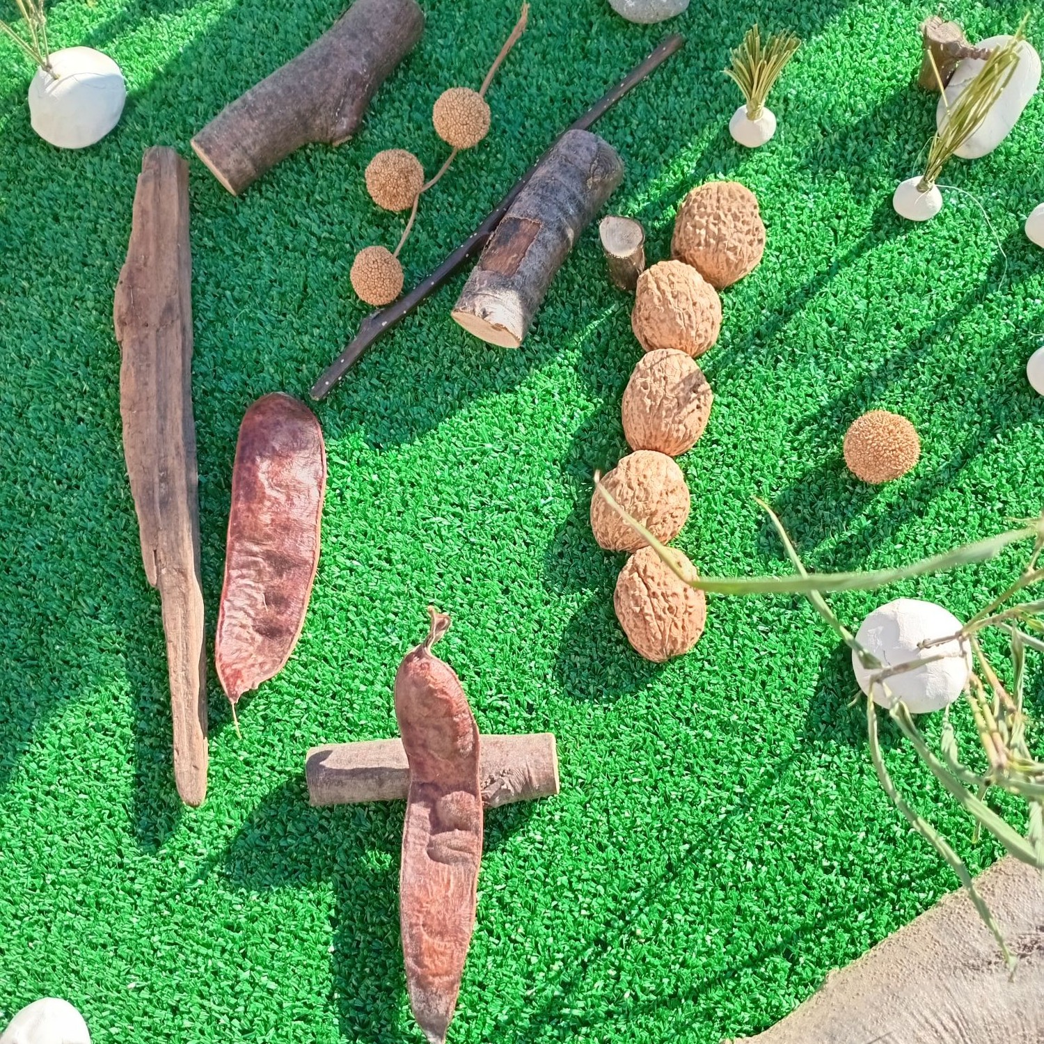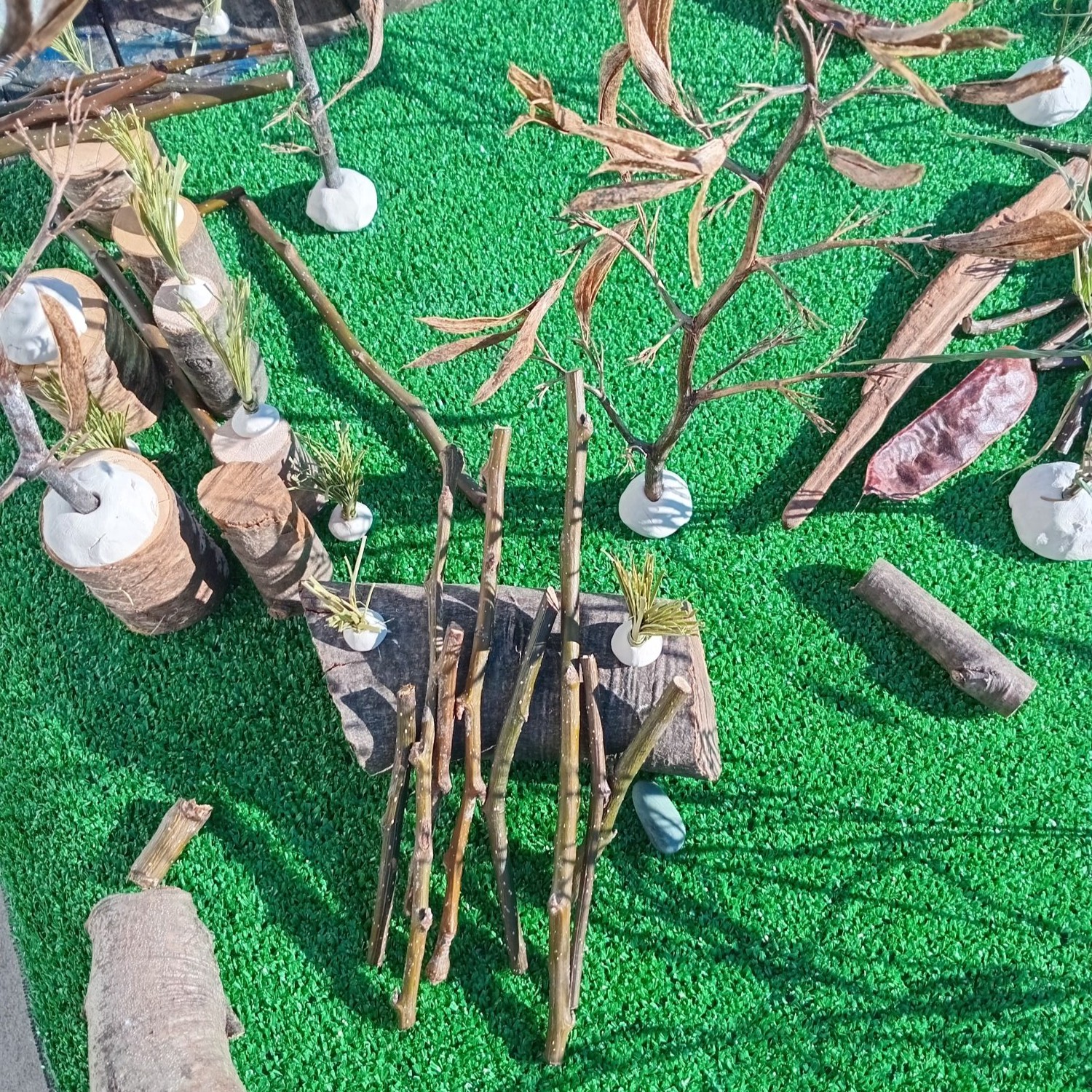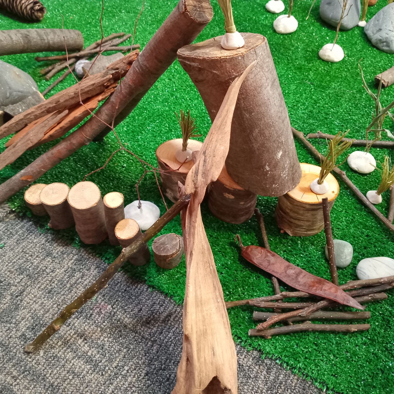 The consultation process with the tamariki first involved a discussion of what they liked to do in nature, what was nature, what could a nature exploration space include and what could it be made of. Following on from this discussion Ramona presented some photos of possible ideas. Tamariki were able to talk to these and share their thoughts on them. And finally a group was chosen to design and construct a miniature play space using natural materials.