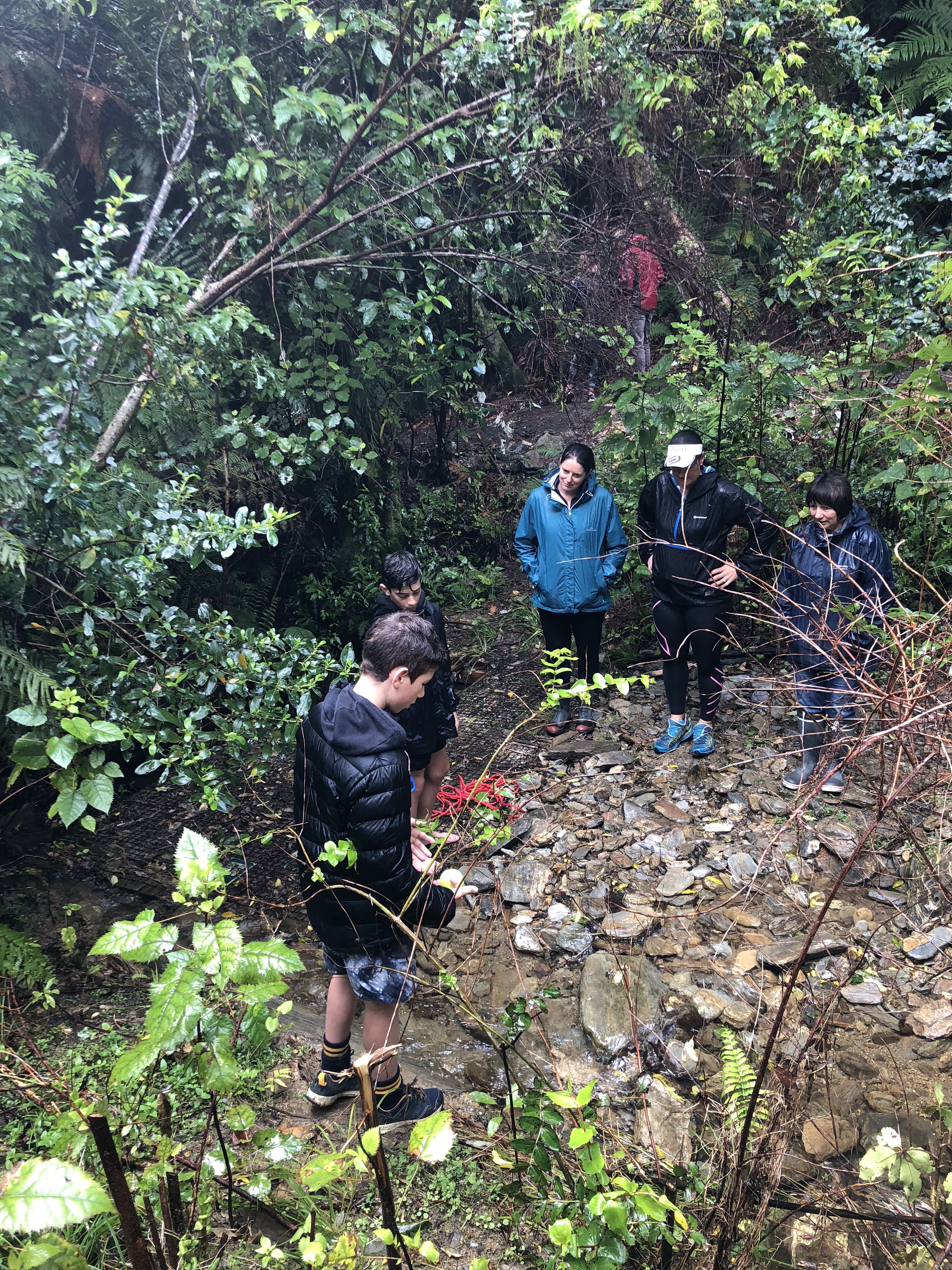 The weather did not co-operate on the day of the workshop, with everyone having to don raincoats to get out and experience the stream, forest and seashore activities that the students had planned and practised. However, the rain did not deter the students, as they got stuck in, explaining and demonstrating the activities, and leading with great enthusiasm. The teachers were so impressed, and commented that it was ‘really brilliant having the Bohally kids facilitating – a great leadership opportunity for them, and great for us too’.