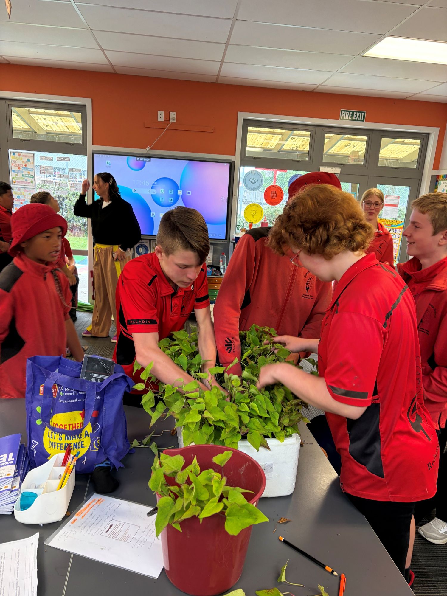 Rachel Ellis, their KEGs facilitator, had already prepared the garden beds with some of the younger tamariki, ready for the big planting. Everyone had the chance to carefully pull the tipu from the kūmara, then take them outside to plant.