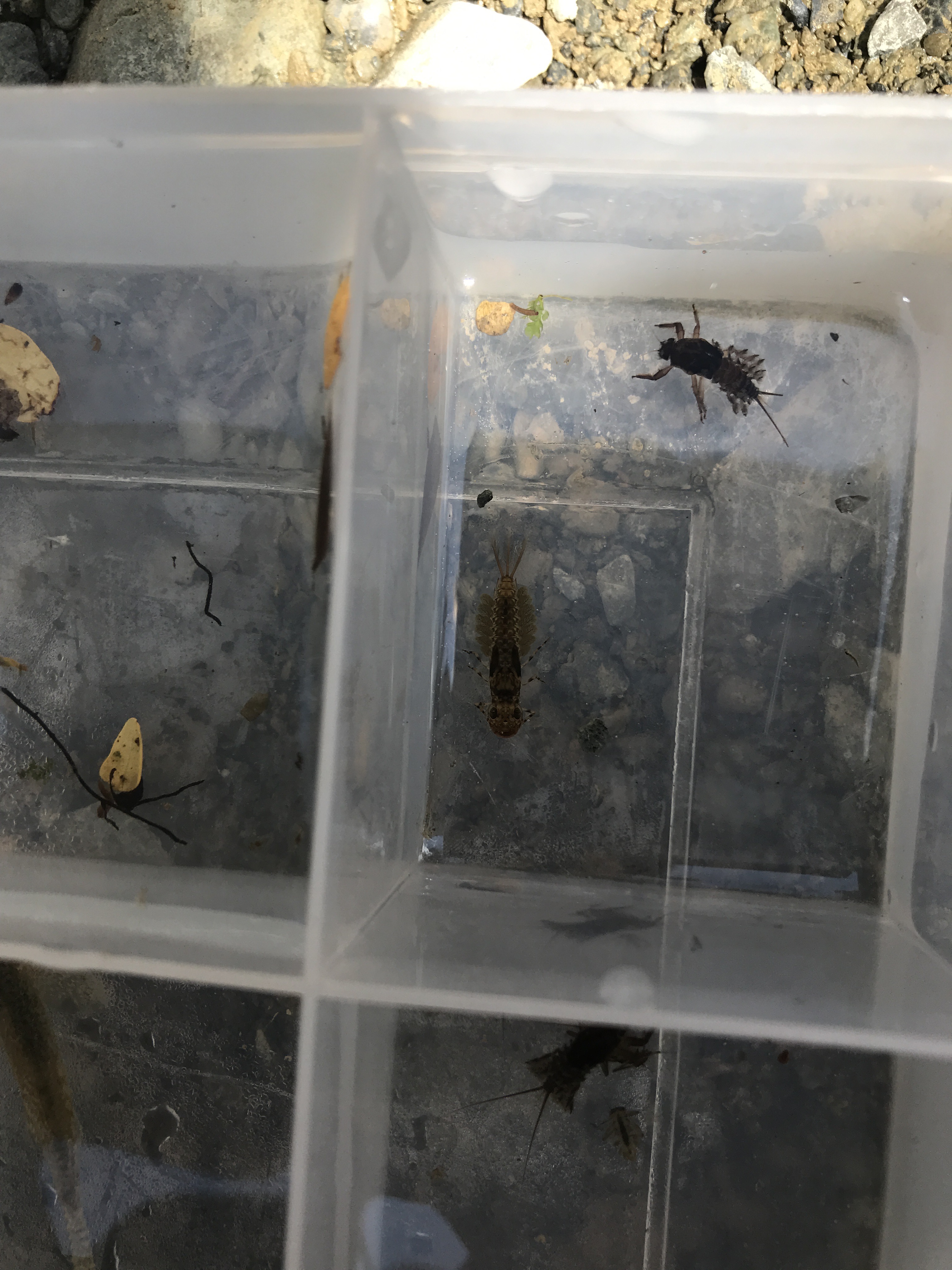 Witherlea students in Year 4 are on camp at Pine Valley this week, and they took the chance to assess the health of Pine Valley Stream at Mill Flat.  The water was beautifully cold and clear, and was rushing along at a brisk pace, so they weren’t surprised to find some top-quality bugs, like the stripy mayfly shown below.  They also found ‘Olinga‘ and ‘Helicopsyche‘ cased-caddisflies, which can only live in beautiful clean water, and some tiny larval fish, which we suspect were young ‘dwarf galaxias’.  Their assessment of the health of Pine Valley Stream?  Very healthy!