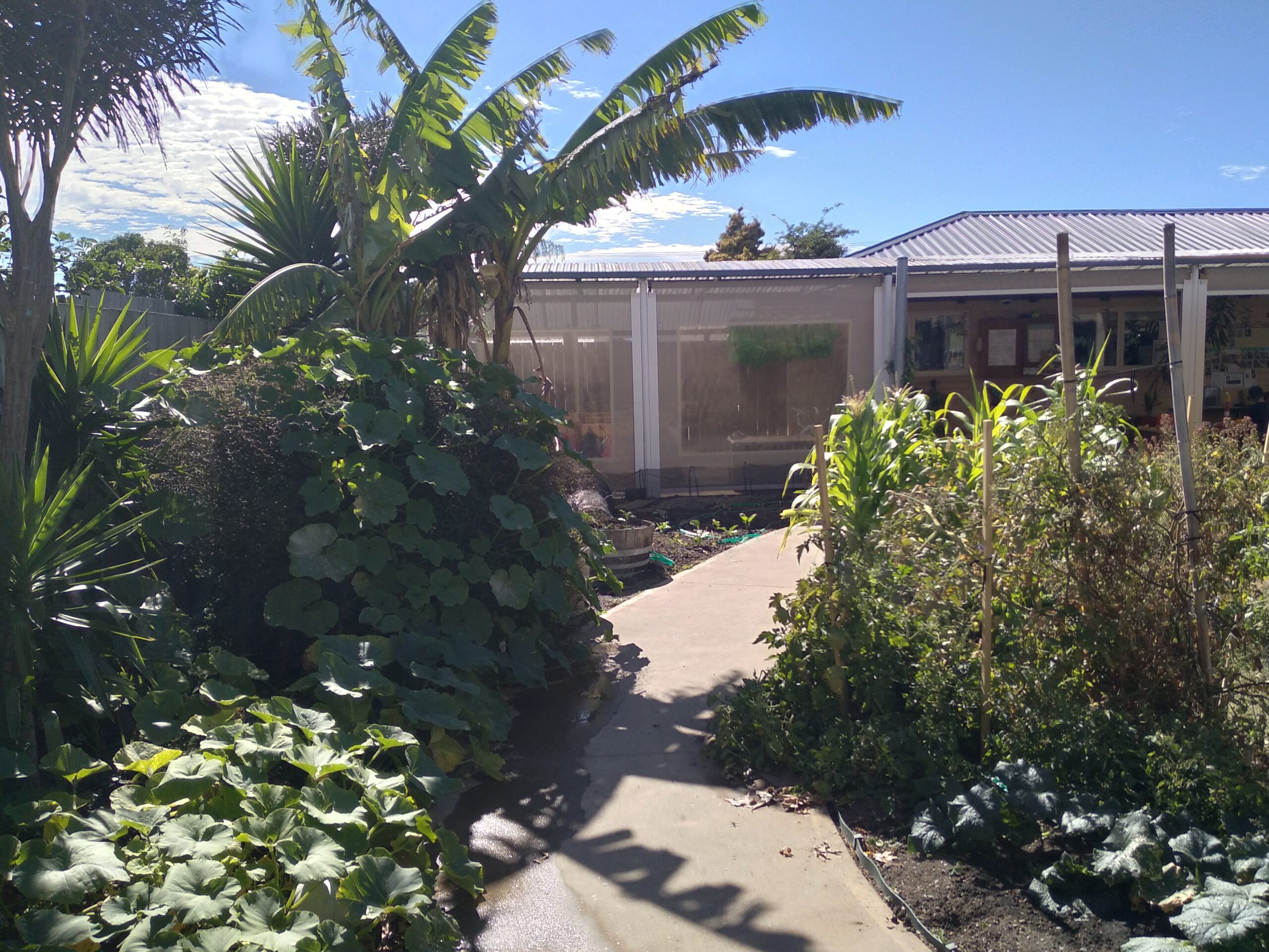 In the garden there is a diverse range of plants from tomatoes, cucumbers, popping corn, kumara, a banana palm (with bananas on it), taro, guava, apples, plums, coffee bean tree and much more.