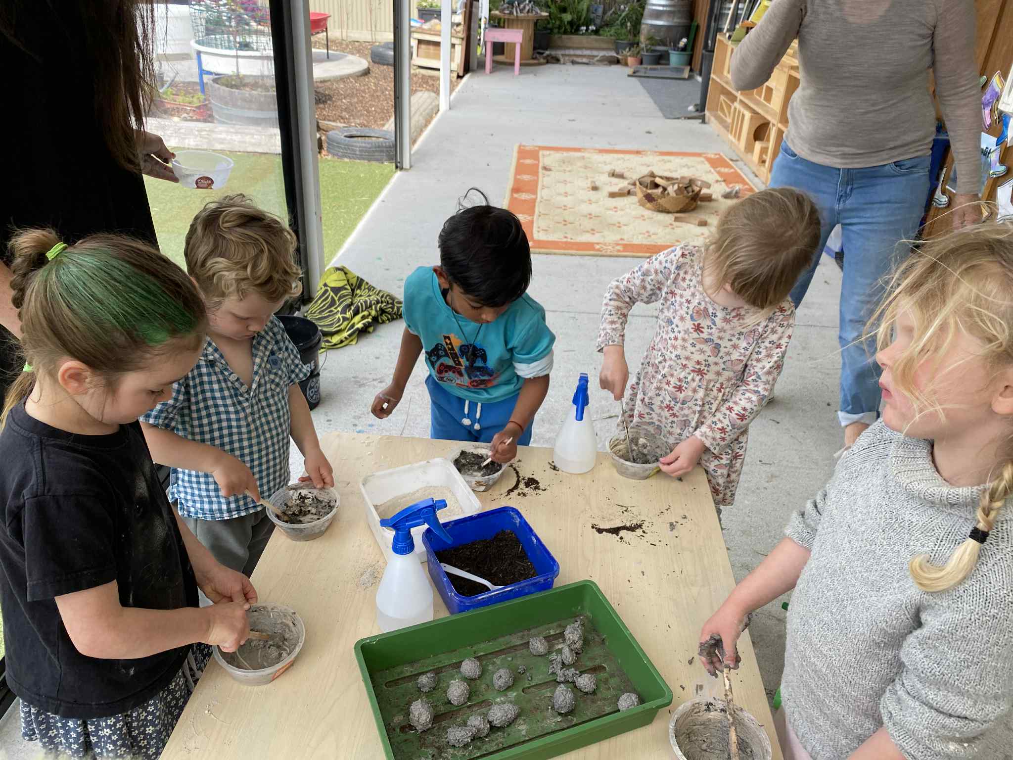 Tamariki at Seymour Kindergarten have trialed planting some of their seed bombs in pots to be like “live herbs”.